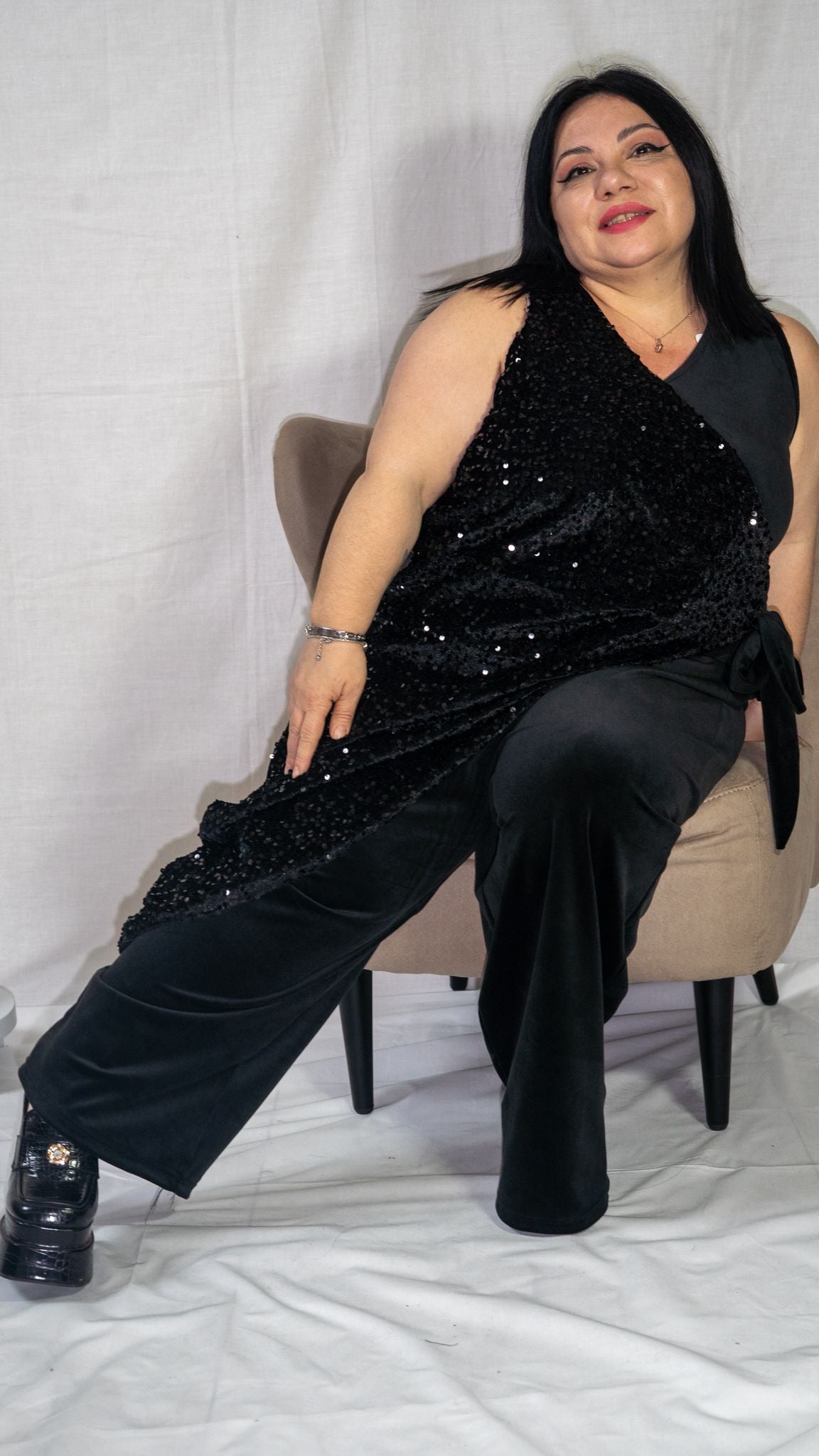 Elegante e luminosa, questa tuta intera curvy in tessuto velutino è il capo ideale per chi desidera un look raffinato e d’impatto. Le paillettes aggiungono un tocco glamour e prezioso, perfetto per valorizzare il look nelle occasioni speciali, serate eleganti o eventi importanti.
